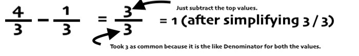 Clarification: As we said, when the bottom value is the same for both numbers, we take it as common. So we took 3 as common for the bottom value. We subtracted 4 – 1 to get the top value. So we got 3⁄3. Then we simplified 3⁄3 and got 1 as the final value that is the answer.